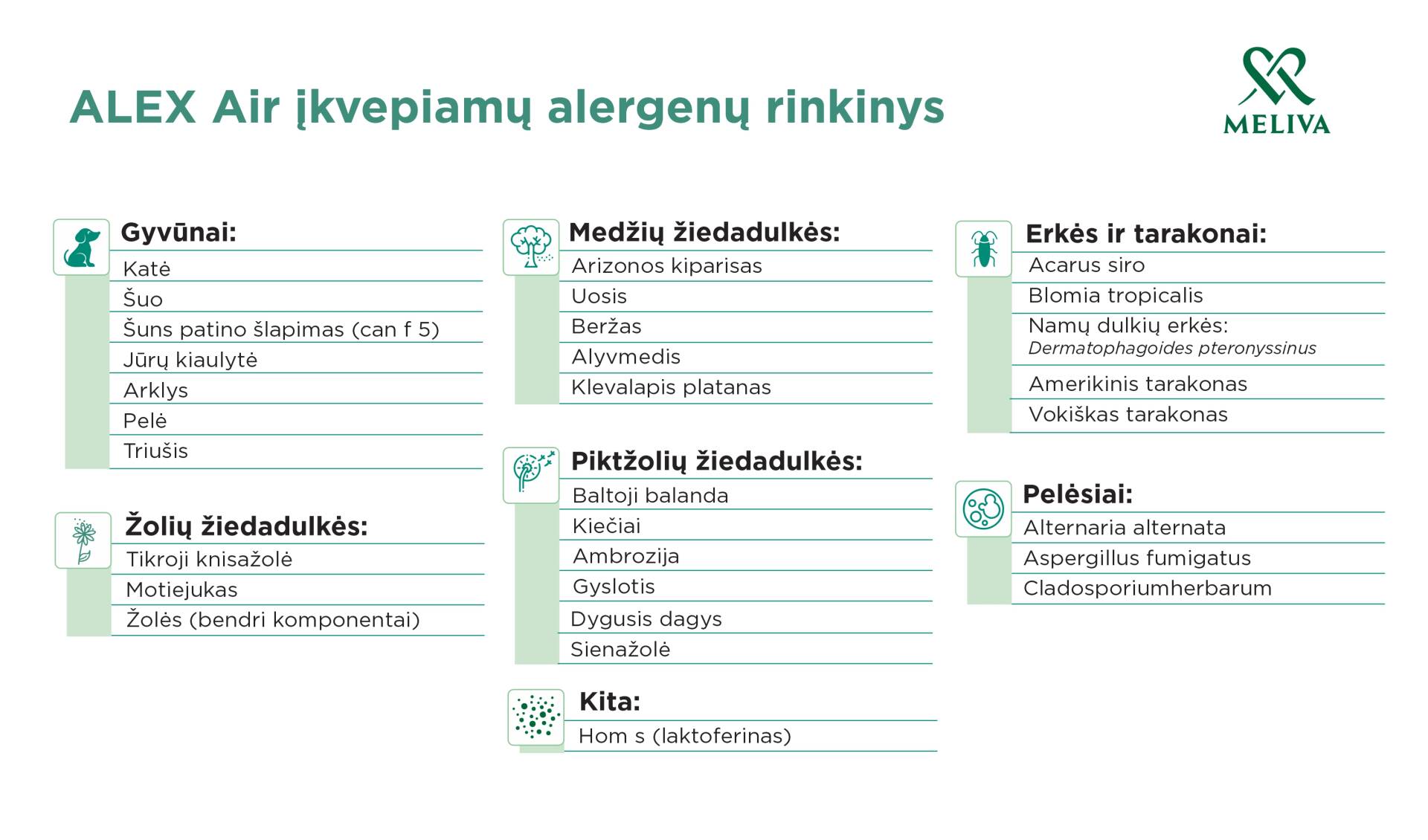 ALEX Air tyrimu nustatomas įsijautrinimas, ne tik dažniausiems Lietuvoje paplitusiems įkvepiamiems alergenams (žolių, medžių, piktžolių žiedadulkėms, namų dulkių erkėms, gyvūnams, pelėsiams), bet ir retesniems, tačiau kliniškai ypač reikšmingiems alergenams.