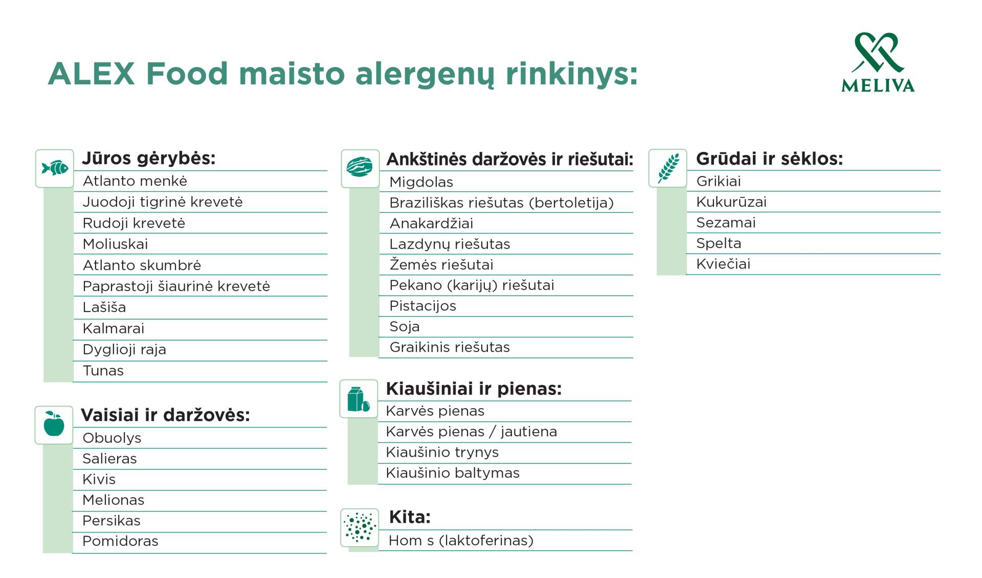 ALEX Food paletė apima 9 svarbiausias maisto alergenų grupes (didįjį devynetą), dažniausiai sukeliančias alergines reakcijas: karvės pienas, kiaušiniai, žemės riešutai, medžių riešutai, žuvis, vėžiagyviai, soja, kviečiai, sezamo sėklos. Taip pat paletės sudėtyje yra vaisiai ir daržovės.